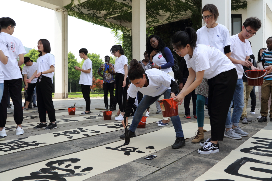 见面会之后,书法学院在照壁广场前举行了一年一度的“畅写阳春”活动,老师与学生们一起书写文天祥的《正气歌》。来自国际学院的150多名留学生参与此次活动。
