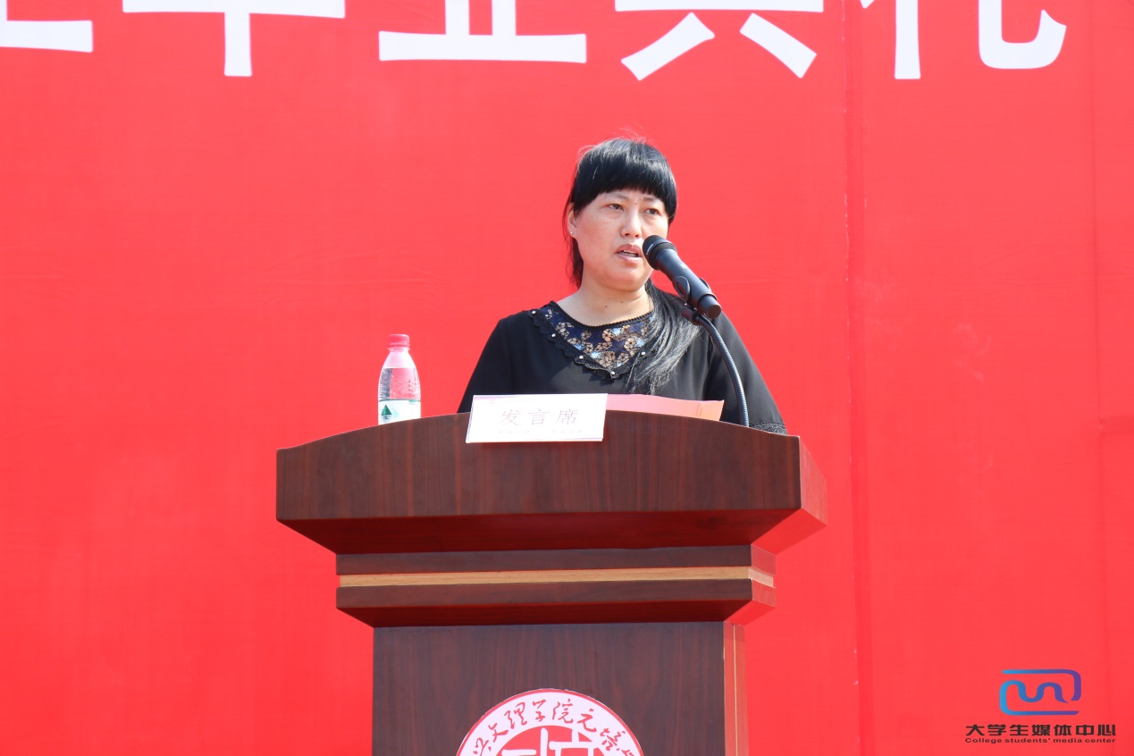 英语1401班钟栗等两位同学作为毕业生代表发言,她表达了对母校四年培养的感激之情,表示今后无论身在何方,身处何位,将不忘恩师教导,脚踏实地、学以致用、用以促学、学用相长。