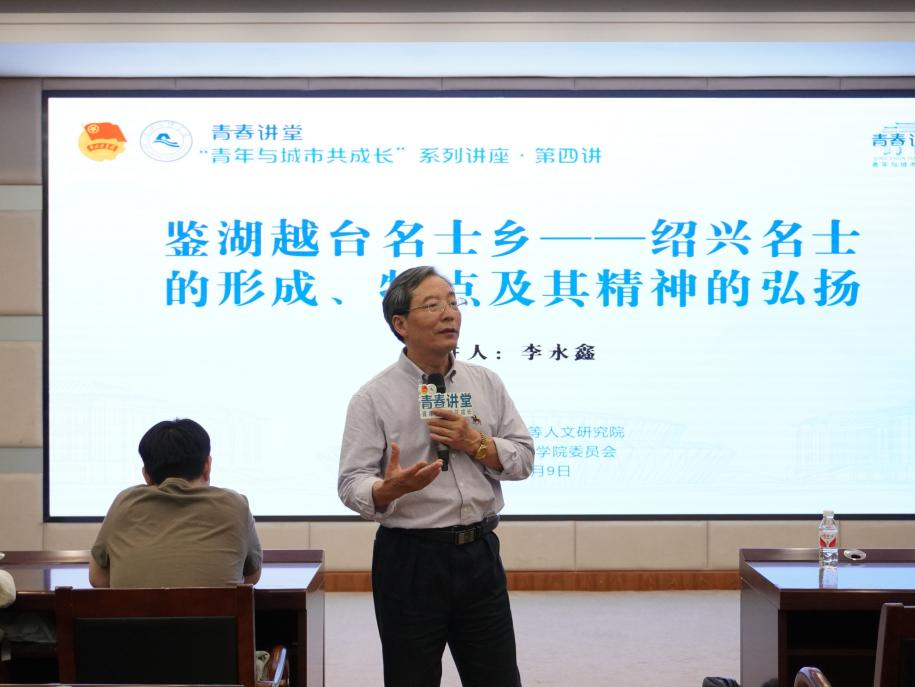 4月9日晚,绍兴市文史研究馆副馆长、绍兴市王阳明研究会专家委员会主任李永鑫以“鉴湖越台名士乡——绍兴名士的形成、特点及其精神的弘扬”为题,从绍兴的文化基因入手,向参加青春讲堂“青年与城市共成长”系列讲座第四讲的师生们娓娓道来绍兴的地域文化特色及其对绍兴经济、社会、人文的塑造作用。