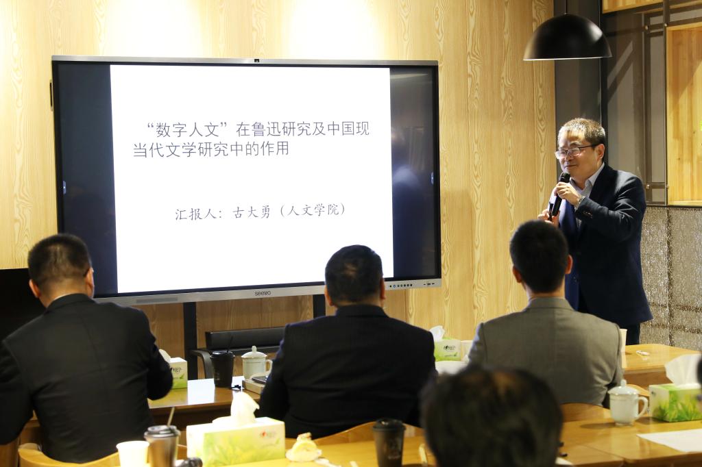 5月8日下午,第五期“人才会客厅”活动在学校“人才之家”举行。本期“人才会客厅”以“数字人文,协同创新”为主题,邀请了浙江越生文化传媒集团副总经理兼副总编辑、绍兴市文献学与数字文化研究中心主任李相银,兰亭书法艺术学院刘小华教授,图书馆李秀明教授,人文学院刘亮教授、古大勇教授作主题发言。校党委副书记沈赤,浙江越生文化传媒集团创始人、董事长寿林芬,校党委人才办有关负责人,学校相关学科高层次人才、师生近40人参加活动。此次活动由学校党委人才办主办、人文学院承办。