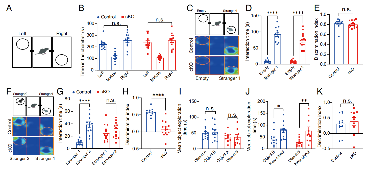 为了探究Efr3b在脑中的生理功能,我们将Efr3bf/f小鼠与Nestin-cre小鼠杂交,以获取在神经细胞中敲除Efr3b的条件性敲除(cKO)小鼠。行为学检测发现,敲除Efr3b对小鼠的空间学习和记忆、焦虑行为、恐惧记忆、社交互动及嗅觉等没有显著影响,但社交新颖性识别(social novelty recognition)能力显著下降。