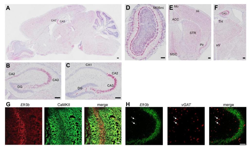 本研究中,我们首先利用RNAscope原位杂交技术对Efr3b的表达进行了检测,发现其mRNA广泛表达于脑中不同区域,但在海马的CA2/CA3区高度富集。