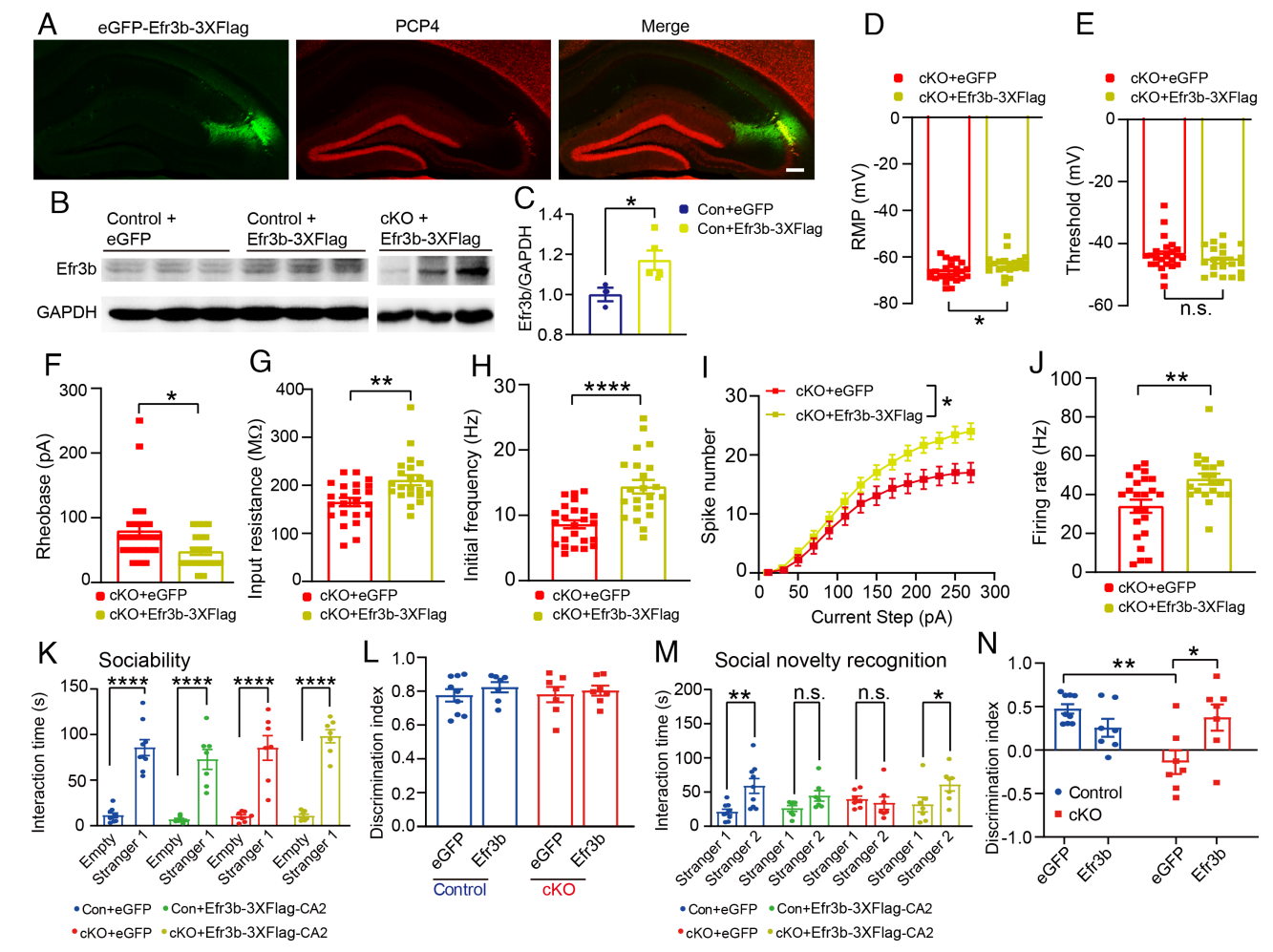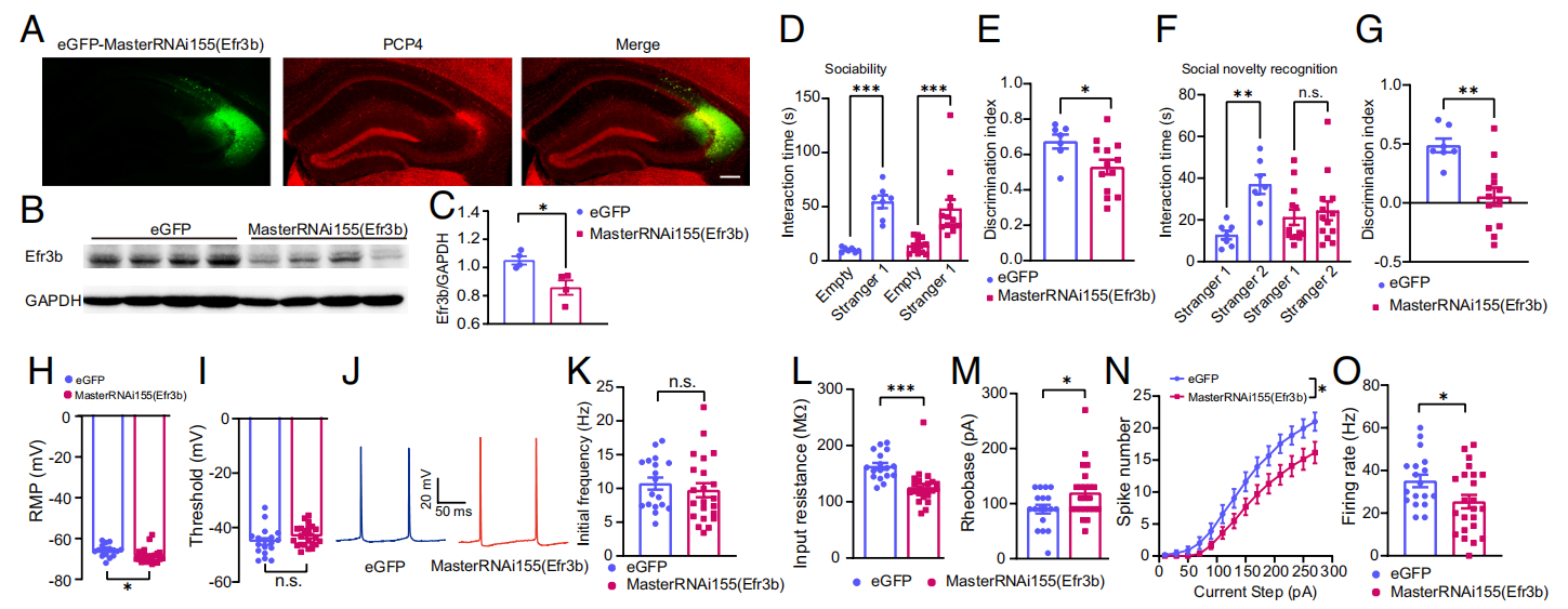 为了进一步验证Efr3b的功能,我们在正常对照小鼠的CA2锥体神经元中敲降Efr3b的表达。结果发现,敲降Efr3b后CA2锥体神经元对兴奋性显著下降,小鼠的社交新颖性识别能力也受到明显影响。