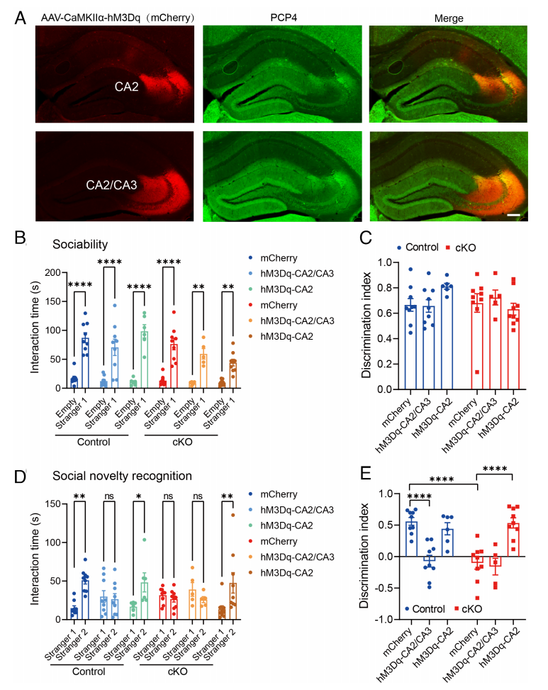 化学遗传学激活CA2锥体神经元,改善Efr3b条件性敲除小鼠的社交新颖性识别能力