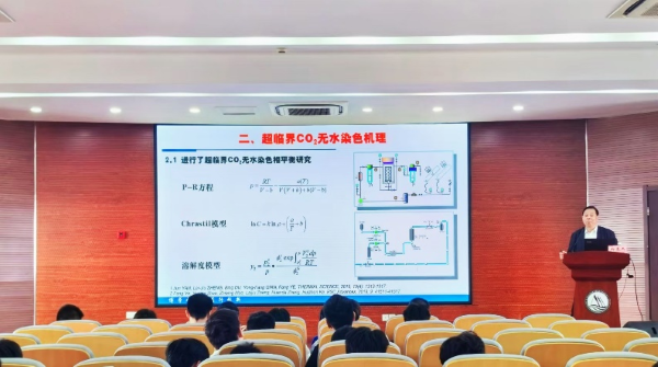 学院师生代表聆听了报告,并就超临界CO₂无水染色设备、分散染料的超临界CO₂无水染色技术应用等问题与郑来久进行了深入的交流和探讨。