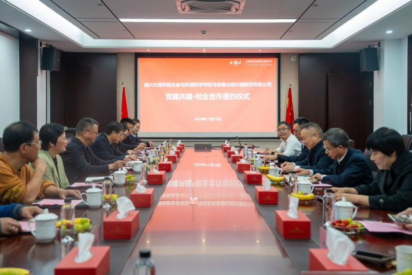 夏婷与杨国军签订党建共建合作协议。胡保卫为大学生就业创业实践基地、实习(实训)基地授牌。交流期间,生命与环境科学学院一行参观了会稽山黄酒博物馆。